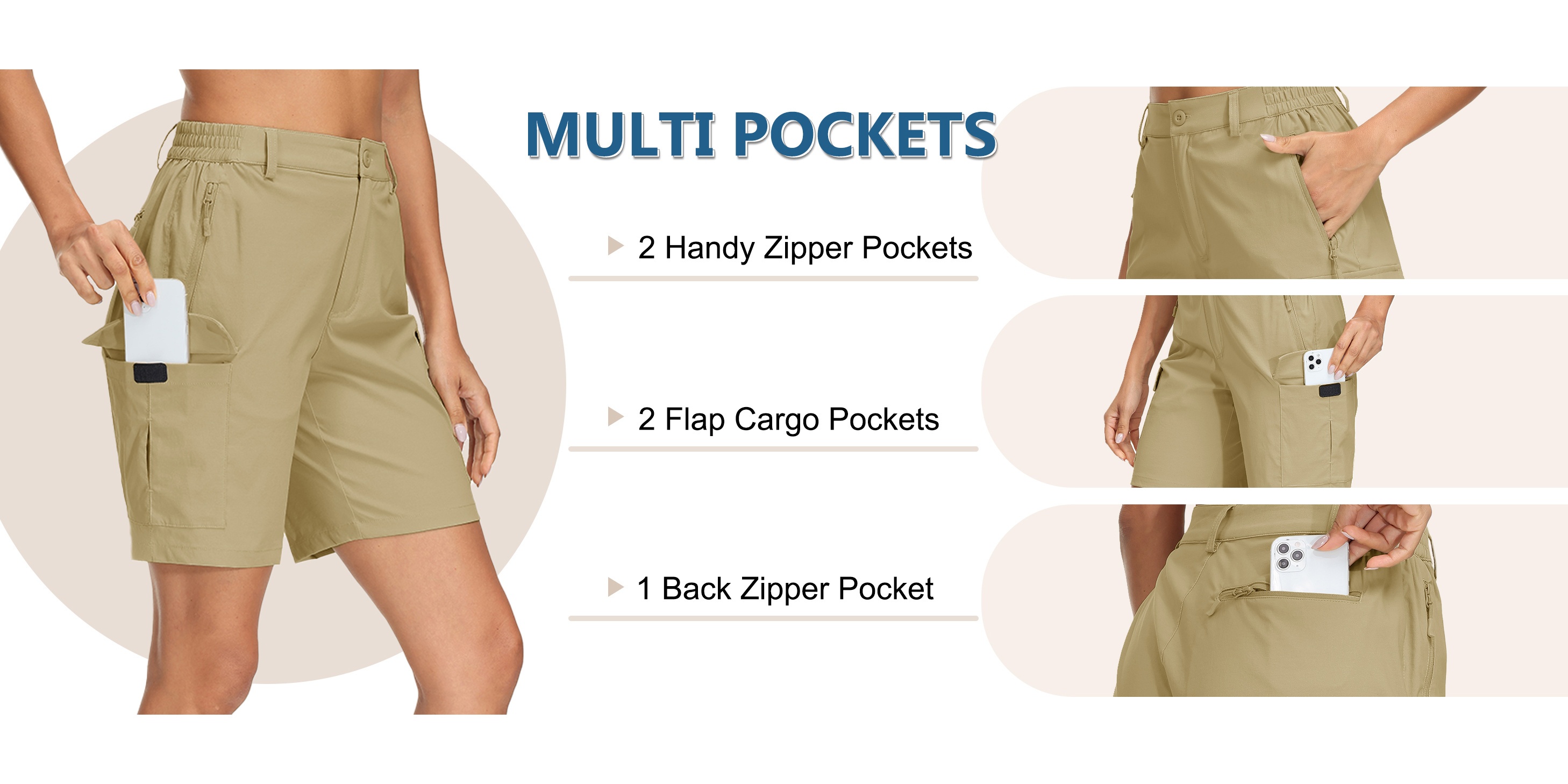 & Quick Dry: This hiking cargo shorts featured with the function of moisture-wicking, which allows your body to breathe well and deliveries quick-drying comfort for the trail ahead to hot-weather hikes.